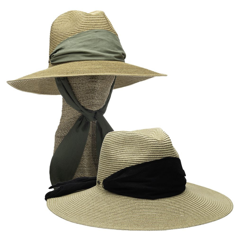 Emelia Paper Braid Safari Hat With Tie. Features A Stylish Band Loop Detail With Black Or Olive Scarf Tie.