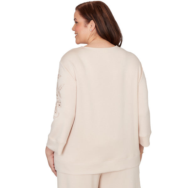 Seville Cut Out Floral Top In Womens Sizes. Delicate embroidery blooms across the neckline of this top, bringing feminine charm to its neutral design. The beaded split neckline, three quarter sleeves, and straight hemline complete the look with balanced polish.